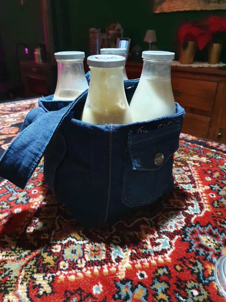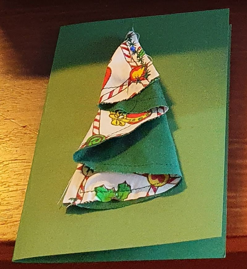 Projecten met de naaimachine Kerstkaart gemaakt met behulp van de naaimachine Scrunchie gemaakt voor kerst Flessentas gemaakt voor 4 flessen
